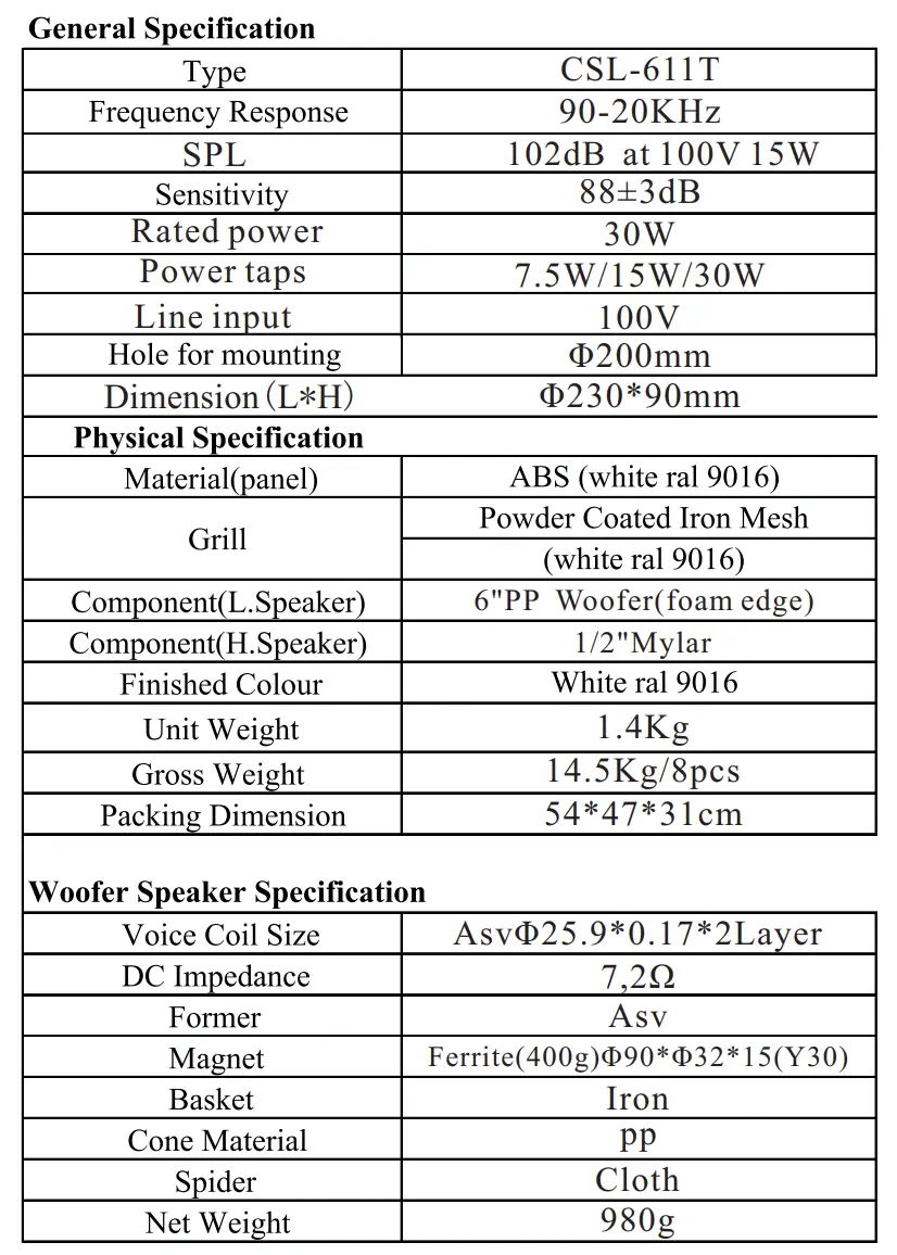 The CSL Series of co-axial full range ceiling speakers is designed for indoor applications. As all 3 sizes include a 100V line transformer they offer a great selection to meet your installation requirements. These low profile, attractively finished speakers have outstanding performance, are very easy to install and include the quick fit grill.